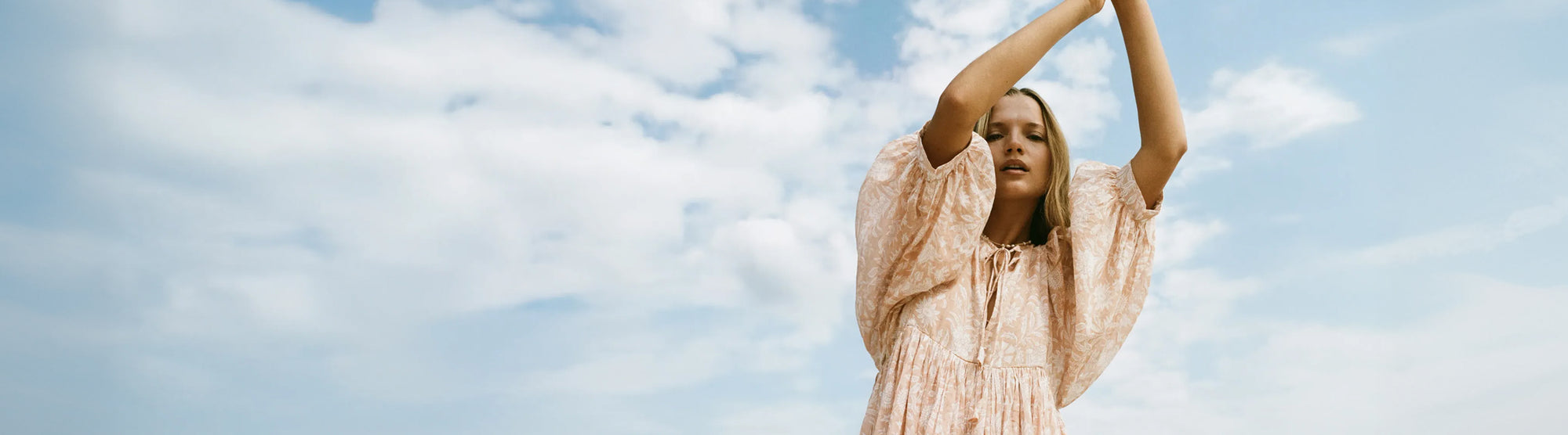 Sundress Midi Peach — full length beach portrait, model in straw hat, sleeveless silhouette with tie-gather neckline and A-line skirt, hand block print peach floral cotton, artisan Jaipur India | Daughters of India Sundress Midi Peach — studio full length front view, model facing camera, sleeveless sundress with tie-gather neckline, flared A-line skirt, hand block print peach floral cotton, artisan Jaipur India | Daughters of India