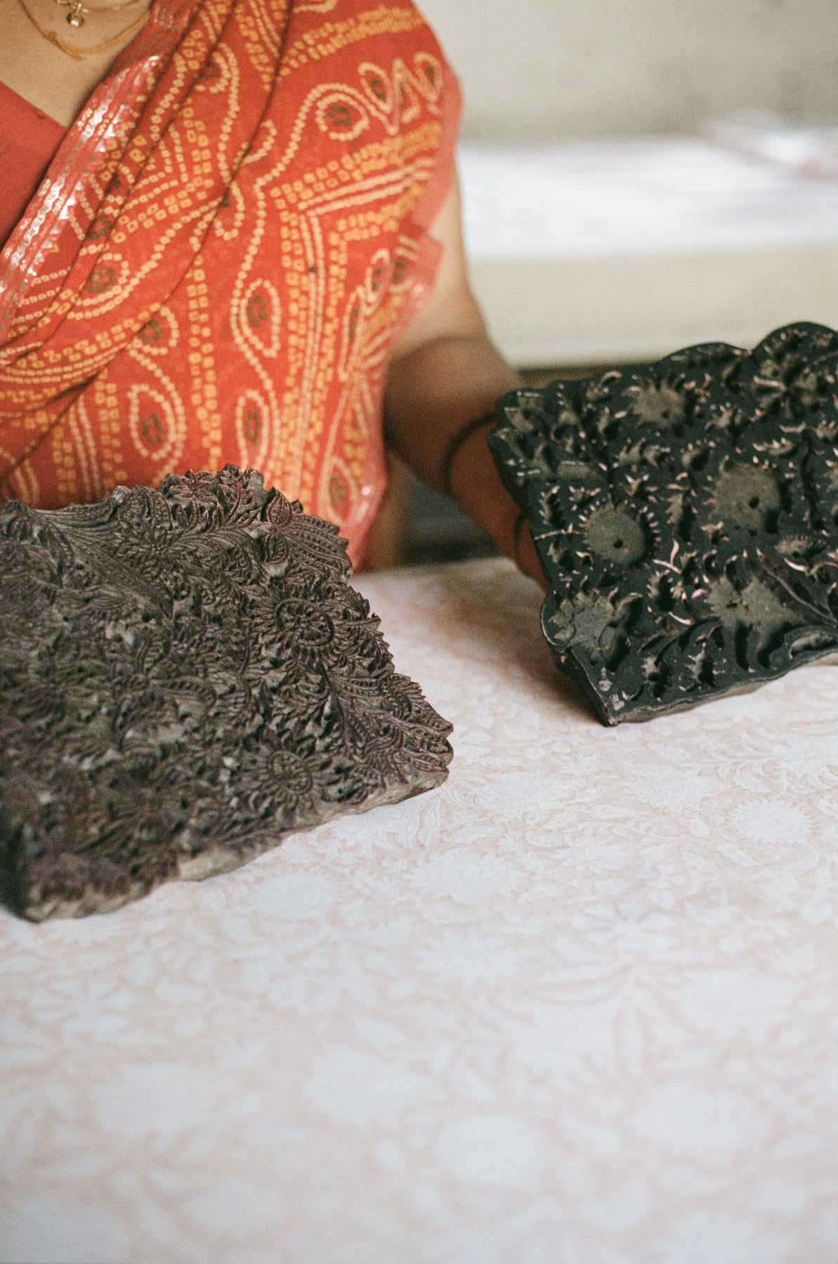 Our signature Kyra Mini Dress silhouette in Apricot Blush has been lovingly hand block printed with a traditional Jaal block design inspired by the sacred lotus flower.