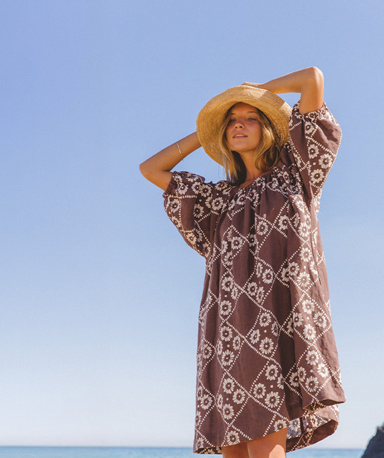 Sundress Mini Almond — studio full length front view, sleeveless mini sundress with tie-gather neckline, warm almond cotton hand block print, short hemline, artisan Jaipur India | Daughters of India Sundress Mini Almond — studio back view, open back silhouette, mini hemline, tie-gather neckline, warm almond hand block print cotton dress, artisan Jaipur India | Daughters of India