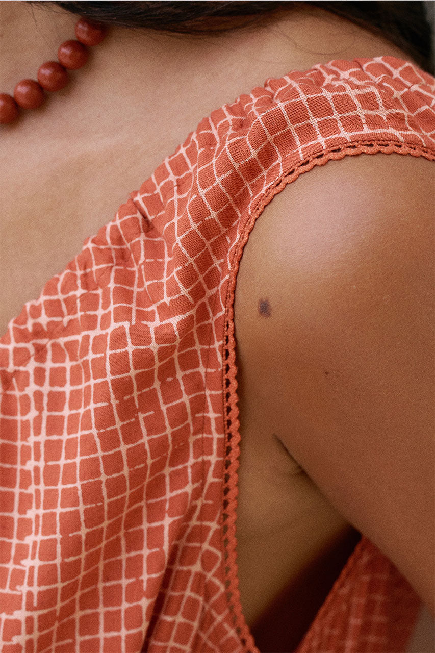 The Sundress Midi in Marmalade features a warm, sun-drenched terracotta adorned with a delicate hand screen-printed grid — fine white lines forming a gentle check pattern across the fabric, beautifully subtle and unmistakably handcrafted. With a sleeveless silhouette, adjustable tie gathering at the neckline, decorative trim along the sleeves & hem, and convenient pockets, it's perfect for warm summer days or layered during the cooler months.