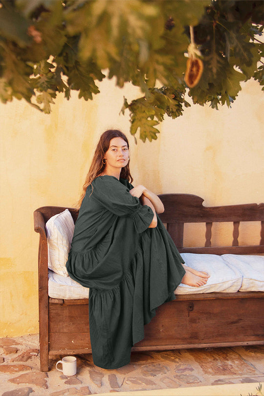 The elegance of our Sahana Gown is sure to evoke the inner goddess making everyday wear effortless. This timeless design is featured in a tiered silhouette with a soft round neckline, pockets, and puff sleeves for added shape and character.